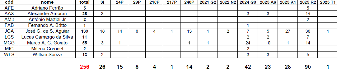 Abaixo segue o relatório de observações visuais realizadas no período de janeiro a dezembro de 2024 incluindo quais os cometas em que cada observador participou com seus registros e o total de observações para cada cometa.