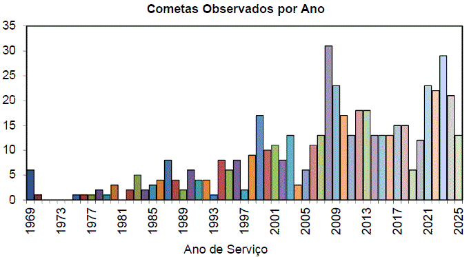 No período de janeiro a dezembro de 2025 recebemos 256 registros visuais de 9 observadores englobando 13 cometas.Os dois cometas mais observados foram: C/2024 G3 (ATLAS) e C/2025 R2 (SWAN).