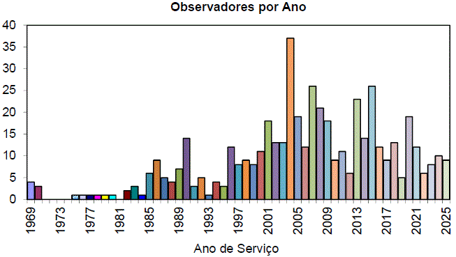 Confira o Quadro de Observadores Visuais.Até 31 de dezembro de 2025 acumulamos um total de 11982 registros visuais, aproximando da marca de 12 mil observações. Essa evolução é vista por meio dos gráficos abaixo:
