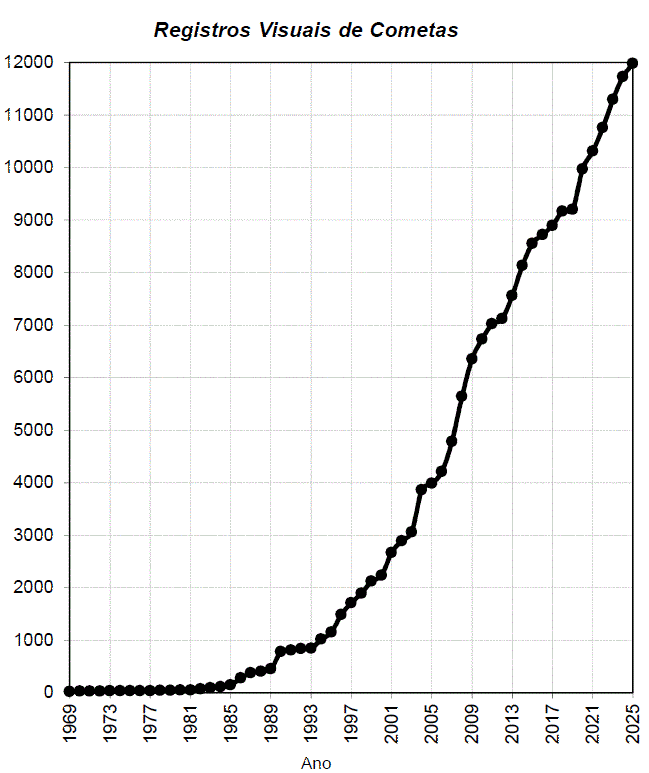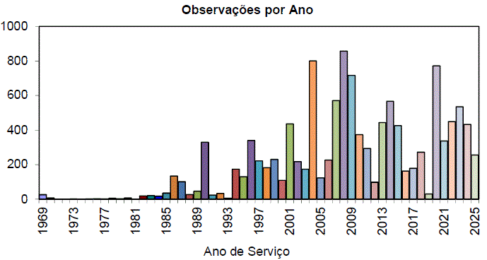 Confira o Quadro de Observadores Visuais.Até 31 de dezembro de 2025 acumulamos um total de 11982 registros visuais, aproximando da marca de 12 mil observações. Essa evolução é vista por meio dos gráficos abaixo: